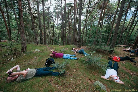 In the afternoon we plunged back down into Alpine woods in the Pfyn/Finges Park for a cool, dark walk, occasionally lit up with goldenrod and the orange berries of mountain ash and softened underfoot with a carpet of pine needles. We crossed the Rhone on a swaying rope-and-plank contraption called the Bhutanese bridge. About halfway through, some of us were wishing we had prayed a bit harder at the Buddhist shrine at the beginning. The return directly over the riverbed was a pleasanter scramble over stones showing sage green and pink in the water.