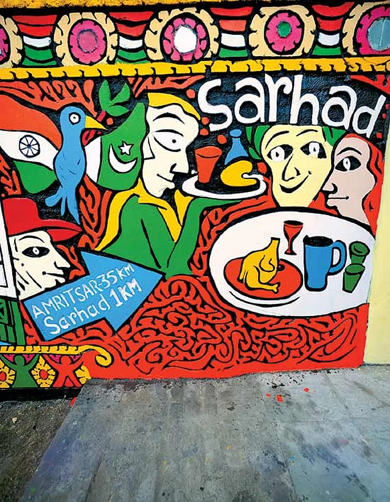 I pegged my hope of recovering from this misplaced display of nationalism on the more soothing ambience of Sarhad, a kilometre away from the Wagah border. Aman Jaspal, owner of the concept restaurant, ushered us into a contrasting world of accord. My eyes immediately fell on the intricate jali work segregating tables and the hand-painted live counters. Outside, two mini trucks had the signature touch of Pakistani artist Haider Ali, with his simple but busy style. Every aspect of Sarhad was a celebration of the architectural, cultural and culinary heritage of pre-Partition Punjab. Right from the food, furniture and furnishings, Sarhad synthesised the common heritage in the most heartwarming manner. Aman mentioned how he makes several trips across the border to engage artistes, designers and chefs to bring the flavours of Lahore to Amritsar. Even the restaurant&rsquos logo has a white pigeon surrounded by the word &lsquopeace&rsquo in 25 languages.