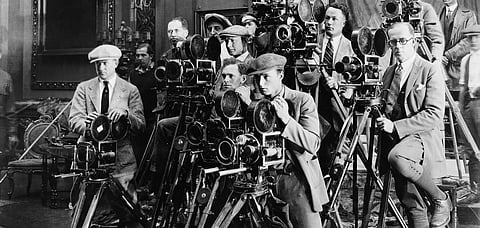 Spectators climb over furniture for a glimpse of the signing of the Treaty of Versailles, in 1919.