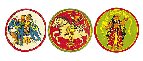 Ganjifa&mdash&lsquoGanj&rsquo being Persian for treasure&mdashwas a well-known card game in Mughal times. Babur mentioned it in his memoirs and, according to Abul Fazl, Akbar simplified the game. Eventually two main styles emerged a 96-card Mughal ganjifa and a &lsquoHinduised&rsquo 120-card Dashavatara (based on Vishnu&rsquos 10 avatars), much played in Bengal, Odisha, MP, Rajasthan and Nepal. The elite used ornate sets made of ivory or tortoise shell inlaid with precious stones, while commoners used cheaper sets made from wood or palm leaf. Pieces of cloth were used too&mdashglued, dried, primed with tamarind-seed extract, coated with lime, and burnished with stone before being painted.