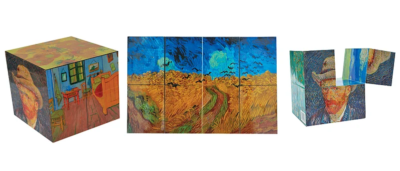 When you're at the gift shop of the Van Gogh Museum in Amsterdam, its easy to get carried away. There is just so much creative merchandise in there that appeals to someone who loves the unique, vigorous brush strokes of the master. After much thought, I decided to buy a poster of The Bedroom and a pack of brushes, and reluctantly let go of the coffee mugs. But this magic cube was a no-brainer. The puzzle can be played around with to reveal eight of Van Goghs famous paintings, namely The Harvest, Wheatfield with Crows, The Yellow House, Self-Portrait with Felt Hat, Sunflowers, The Bedroom, Almond Blossom, View of Auvers and Boats at Saint-Maries. For 8.95, I now have eight classic paintings by one of the most influential post-impressionist painters making up a stress-buster at my desk
