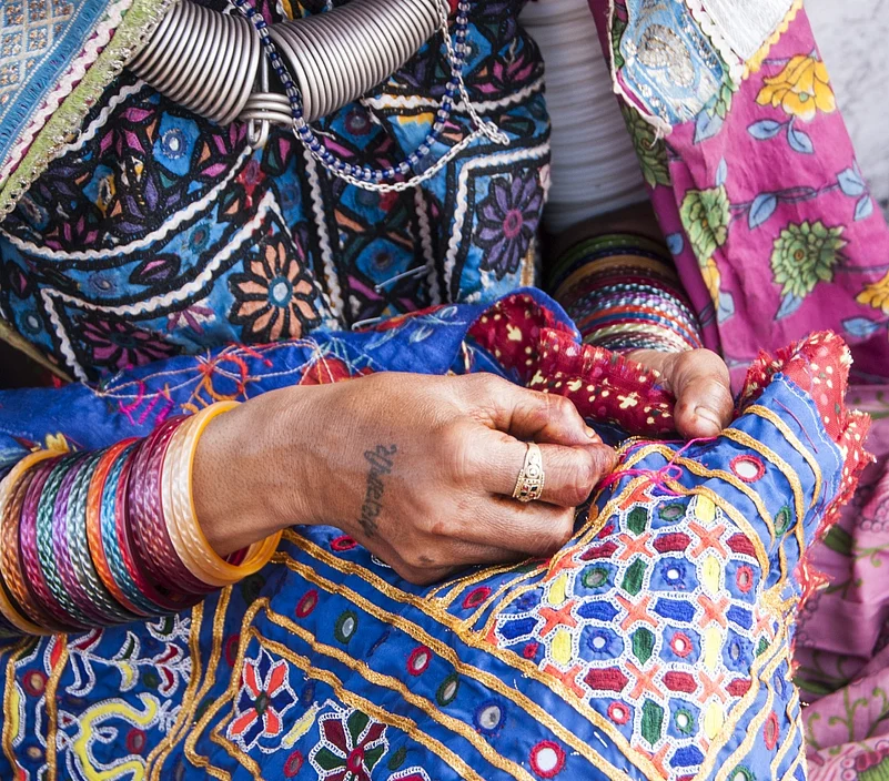 The Kutch region in Gujarat is home to more than 40 tribes, each with a distinct style of attire and embroidery. Their work is more than just a decorative item for the home it is a crucial form of personal, societal, and spiritual expression. As a sign of individual and group identification, the ladies embroider, employing distinct threads and motifs. Each community has its own needlework style (the region is claimed to have more than 17 distinct types of embroidery). The Ahir community's work is dense and bold, as are the Jats' Jat-Garaasiya and Jat-Fakiraani styles, the Sodhas' Soof and Khaarek, the Meghwad-Maarus' Soof and Khaarek, and the Rabaaris' Rabaari. Travel around villages, and you will find women engaged in embroidery and weaving, making clothes for themselves and their families, or creating pieces for a bridal trousseau or for a festival.