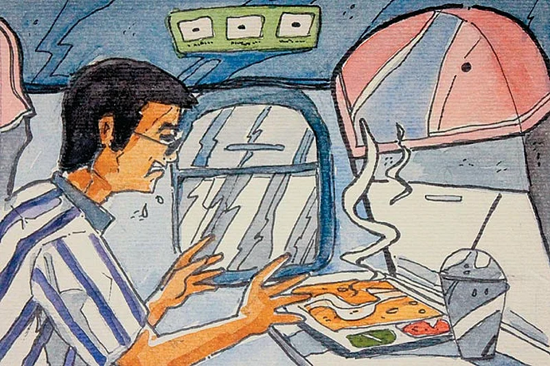 Weak with hunger and cold from the pre-dawn taxi ride to the airport, I soon drifted into a semi-comatose state, dreaming of succulent and subtly perfumed biryanis of the finest Hyderabadi gharana. I remained thus suspended in a state of tremulous anticipation, till the hostess sailed past, when I impeded her passage with a request for veg biryani, on the double, please. Feeling extravagant, I ordered a masala chai as well. So you want veg biryani with tea, sniggered she. My head bobbed up and down in the affirmative.