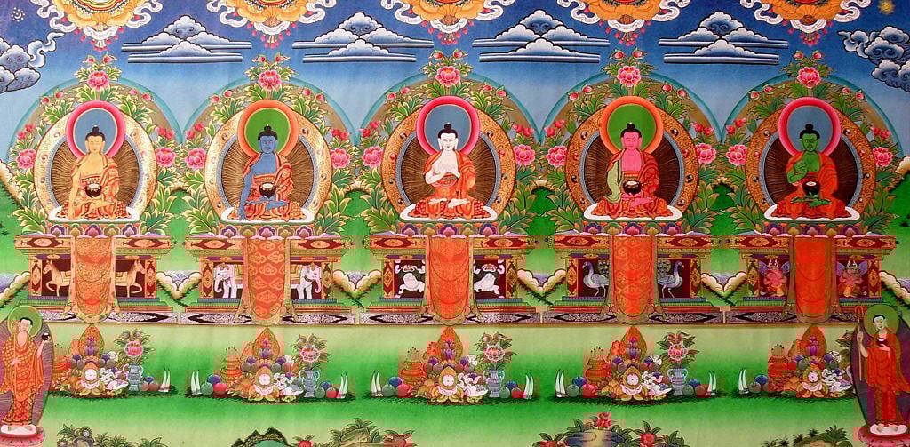 In many wall paintings of the monasteries of Tibetan Buddhism,apart from the historical Buddha, Shakyamuni, you will find images of sets of five Buddhas. They signify a cosmic pattern of the universality of Buddhahood. The five Buddhas are simply Buddha Vairochana or the illuminator in the centre surrounded by Buddha Akshobhya, the Unshakeable, radiant blue in colour Buddha Ratnasambhav, Jewel-born, yellow in colour, who transforms pride into the wisdom of equanimity Buddha Amitabha, Infinite Light, red in colour, the Buddha of love and compassion and Buddha Amoghasiddhi, green in colour, associated with fearlessness. The Pancha Tathagata form the basis of the ordering of all Buddhist deities according to tantric system. All other deities, Bodhisattvas, wrathful gods etc, fall under one or the other of 5 families orkula, headed by one of the 5 Buddhas.