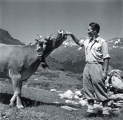 Tenzing liked Switzerland, and thought the Alps resembled his homeland of Khumbu, albeit on a miniature scale. He returned in 1954, for a hike in the Rosenlaui valley near Meiringen where this photo of him was taken. No one knows what Tenzing thought of Swiss cows.