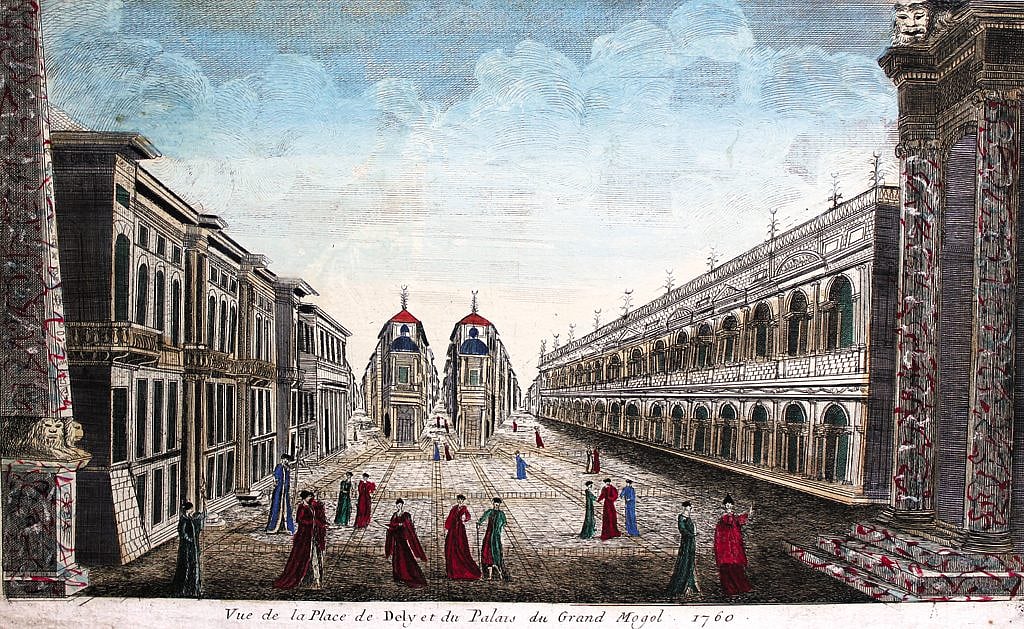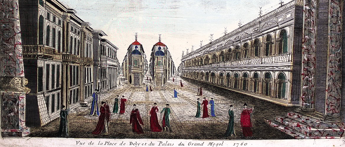 Neither does the Red Fort look anything like the real deal, nor do the people or their attire match historical records. Part of the private collection of Swapna Liddle, author of Chandni Chowk The Mughal City of Old Delhi, the image is an optical print also called vue doptique, which was meant to be viewed through a zograscope, which produced an illusion of depth. This particular image, however, made presumably from hearsay, also produced an illusion of the city of Shahjahanabad that made it look like a European street.