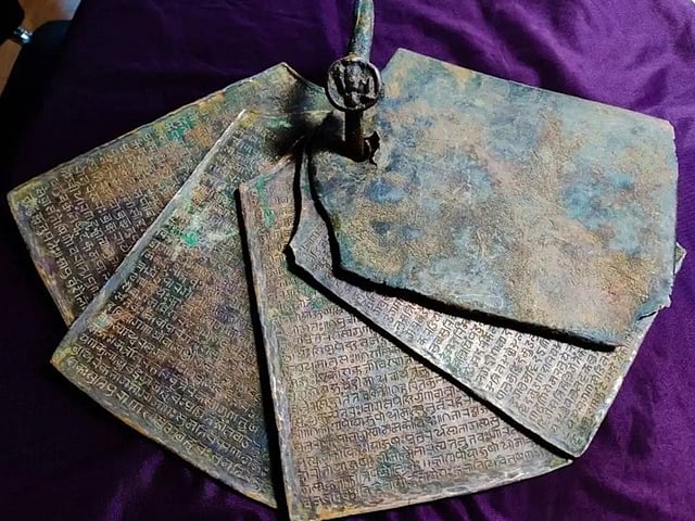 By generating estampages—paper impressions of the inscriptions—the ASI team is deciphering the other two sets: a 7th-century set of two plates with a bull emblem and engravings in Brahmi, belonging to the Maitrakas; and a 14th-century set of five plates in Hale Kannada, with an elephant emblem, belonging to the Western Ganges. The second set has a half-broken plate.