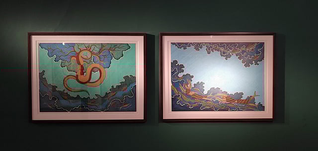 Trees seem too plain a subject for a visit, but city-dwellers may not be familiar with the indigenous perspective towards art beyond famous styles like Pattachitra and Warli. This makes the walk into Ojas much more delightful, as a wall of colour unapologetically hits the eye. The canvases in Message from the Trees are crowded with playful hues, textures and feeling that demonstrate the plants&rsquo venerated position as sacred pillars in the Gond ethos. Some are giant, standalone pieces, where trunks are seen melding with human and animal figures, while Durga Bai and Subhash Vyam (a husband-wife duo) prefer sharing stories across multiple canvases with smaller tree motifs. As someone who struggles with restraint, I appreciated that the joy of being in nature was left unbridled here. You lean in, savour, and move on as required.