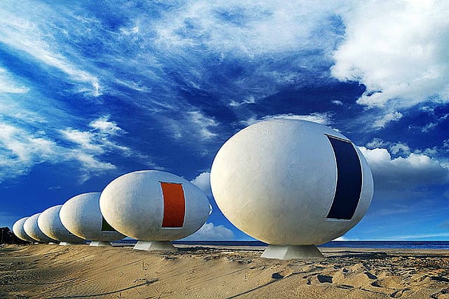 Fancy a beach nap in style on your next trip to South Korea These eight egg-shaped beach pods, named Albang, were installed on the sea beach of Yangyang, South Korea. Created out of polystyrene, the material with which disposable cups and plates are made, these huts are light enough to be transported to other beaches. Korean studio Yoon Design Space is behind these 74 sq. ft space-age pods, each of which has a flip-open door in a bright colour, porthole windows and a floor covered in blue-green linoleum.