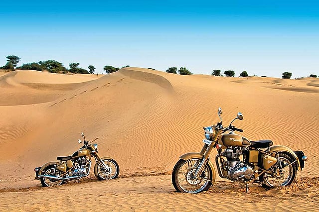 Riding around Rajasthan on a motorcycle is like being dropped into a period drama, where the architecture, the people, the customs and the landscape look very much like they did a hundred years ago. Royal Enfield&rsquos Classic 500 is a rather convincing retro motorcycle too, in the way it looks at least. But it&rsquos also a modern electronic fuel-injected machine launched in late 2009 that carries on the spirit of the original. Two new variants of the Classic 500 were revealed recently at The Serai, an elegant and luxurious tented camp, cleverly tucked away in the scrublands, thirty kilometres outside Jaisalmer.