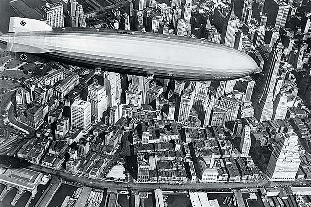 Under the Nazi regime, the zeppelin was turned into a potent symbol for propaganda purposes, and the fiercely anti-Nazi Eckner was banned by Joseph Goebbels. A new ship, The Hindenberg, was commissioned. It was the largest zeppelin and was fitted to be powered by helium, which was non-flammable, as opposed to hydrogen. It was soon pressed into transatlantic service, alongside the Graf Zeppelin. This iconic picture of The Hindenberg was taken on its maiden flight in 1936 to the naval base at Lakehurst in New Jersey, as it flew over Manhattan.