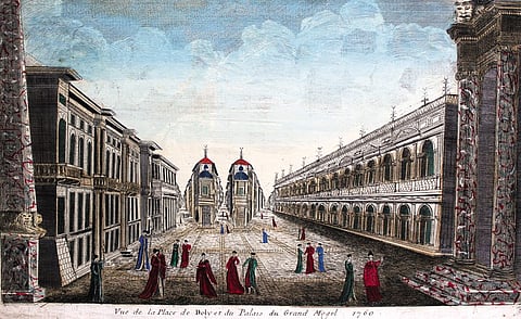 These days, when travel guidebooks and trip-advising sites abound, even the impulsive foreign backpacker has quite an accurate idea of what to expect in Indiathe metropolises and the narrow by-lanes of old, quaint towns. In the 18th century, however, this luxury wasnt available to those curious about the subcontinent and its then Mughal rulers. Hence, some European prints from that era are comically off the mark in their depictions, for the artists themselves had never visited the cities they were portraying. Take, for instance, this print from 1760 made by the famous printmaker, Jacques Chereau (1688-1776) of Paris, that purportedly shows the Red Fort and the broad street in front of it (currentday Chandni Chowk).