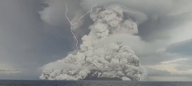 Local news site The Matangi Tonga reported that massive explosions, and thundering lightning had greeted an observer team, working 3.2km off Hunga Tonga Hunga Ha'apai eruption on Friday. The site said satellite images showed a 5km (3 mile) wide plume of ash, steam and gas rising up into the air to about 20km (12 miles).