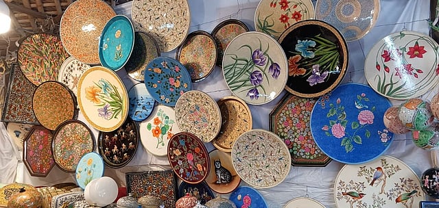 As soon as you enter, a medley of framed paintings greet you, some perched on a tree, some at odd pillars with hawkers calling out to you, dangling beautiful silk kurtas and pashmina shawls in front of your face. Walk ahead and keep walking. On your left will be fluffy carpets and intricate weaves of sarees, shawls and kurtas. As you turn your head right, a shock of blue in the form of imperfectly gorgeous pieces of pottery will occupy your eyes.