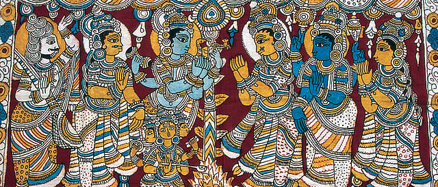 Kalamkari, literally meaning skill in using a quill, is an art found only in Machilipatnam and Sri Kalahasti, further south in Andhra. In Sri Kalahasti, the design is drawn and colours filled through a wax process in Machilipatnam, it is stamped with carved wooden blocks. The former is available mostly as wall hangings the latter, as bedspreads, curtains and cushion covers.