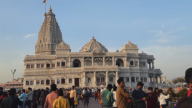 Immerse yourself in the splendour of this temple dedicated to Lord Krishna and Radha, one of the largest in Vrindavan, sprawling across 54 acres of lush green land. This magnificent, two-story marble temple is a testament to the city's rich cultural and spiritual heritage. As you enter the temple compound, you will be greeted by a massive garden adorned with various beautiful trees and fountains. The gardens also boast stunning, larger-than-life sculptures depicting multiple gods and goddesses.