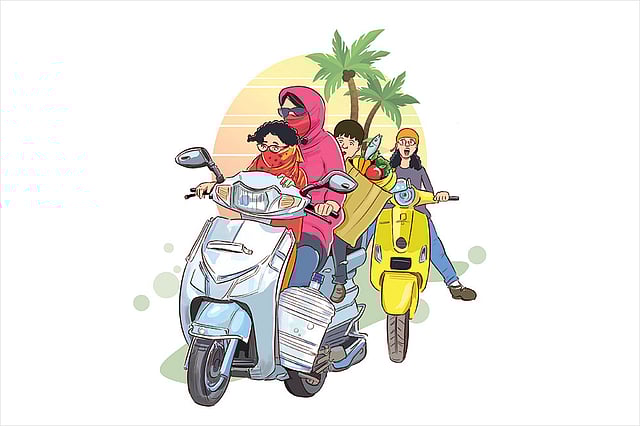 As with most species on the planet, females (Femina Scooteri) are considered deadlier. Identified by their distinctive Japanese ninja-inspired face wraps and sun-battling winter hoodies, they reveal only their eyes and none of their intentions. Unwilling ("Awwvois! So dirty rey baba!") or unable ("Genetic makeup rey") to plant their feet on the tarmac post-braking, the Femina Scooteri overcomes such trivial inconveniences by attempting to stay in perpetual motion—swerving and weaving while balancing two or more offspring and trying to squeeze into nonexistent gaps.