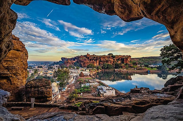 A view of the Badami Fort, in Badami, Karnataka, with the azure sky reflected on Agastya Lake