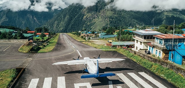 Mountain ranges, strong winds, and a short runway&ndashare all present in Lukla. The gateway to Everest is built on a cliffside between mountains. It is often referred to as the riskiest airport in the world because its runway is only 1,729 feet long and terminates abruptly in a chasm. It is even inclined upward to assist in the slowing of the plane. Additionally, there is no room for go-arounds. So, if an aircraft is in the final descent, it must land.