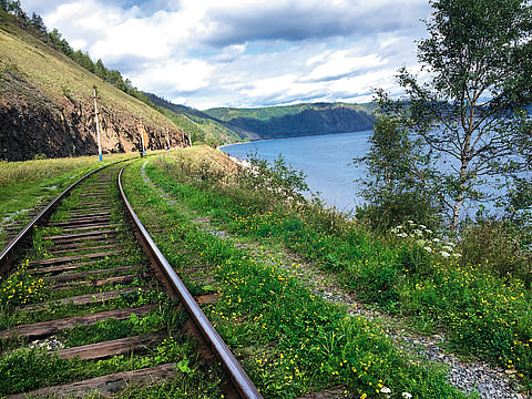 The tracks of the Trans-Siberian Rail run along the edge of Lake Baikal[/caption]