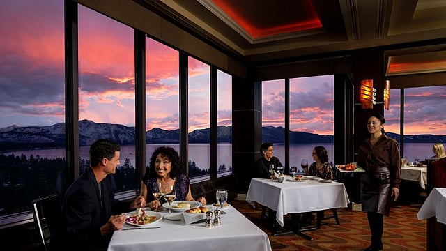 Edgewood Restaurant is a hidden gem in Lake Tahoe. It has stunning floor-to-ceiling windows and an elegant lodge aesthetic. Diners can enjoy striking views of the mountains, pines, and the glistening lake while celebrating anniversaries or creating memorable moments. The masterful culinary team prepares fresh cuisine daily, perfectly matched with a carefully selected and diverse wine list. Be sure to reserve a table just before sunset to secure a front-row seat to the vibrant Sierra sunset, the best show Tahoe offers.
