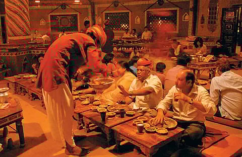 Jaipur, being the capital of Rajasthan, is home to numerous restaurants that offer interesting dishes from all around this desert state. The Mirza Ismail Road, popularly referred to as MI Road, is popular for the many jewellery stores lining up the road, but the real jewels here are the traditional Rajasthani dishes served up at its restaurants. Niros, one of the oldest establishments in town, is frequented by foreign tourists for its delectable food and neat and tidy setting. The gatte ki sabzi served here is an absolute must-have. Natraj is immensely popular for its relatively inexpensive vegetarian Rajasthani thali. Handi serves tender mutton cooked in traditional handis (pots) and smoked with burning charcoal, along with wafer-thin roomali rotis. Next door is the equally pocket-friendly Surya Mahal. MI Road also has several small joints serving samosas, jalebis, creamy lassi and kachoris. If you want some excellent dal baati choorma at a reasonable rate, you can go to Thali House near Sindhi Camp.