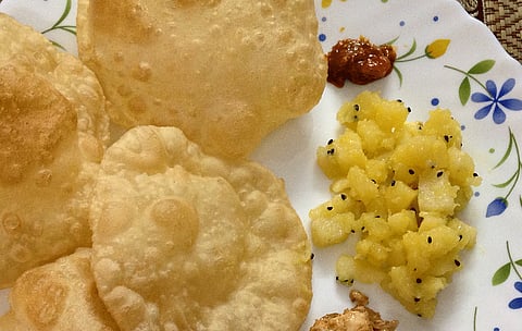 Fresh, light, puffy, crunchy, flaky, melt-in-your-mouth delicious&mdasha luchi is a divine experience. For a Bengali&mdashchild, teen, or aged&mdashluchis are the epitome of Sunday breakfasts. Fried little pieces of heaven which come to your plate piping-hot, deflate them to let the steam escape as you use your hands in a deft motion to tear a tiny piece. A luchi breakfast is never complete without the sada alu torkari that is the accompaniment in its own right. Scoop some of the simple white potato curry cooked with nigella seeds in the small piece of luchi, put the morsel into your mouth, and sigh in joy. Such a treat