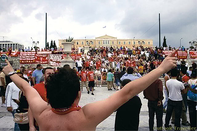 The next evening, hours before the match, Syntagma Square in front of the Parliament had been comprehensively trashed. There was trash and beer cans everywhere, even the pavement underfoot was sticky with beer. The public fountains were foaming with beer. The people in red were tanked and roaring. There were no Italians to be seen.