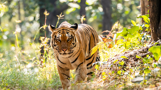 Visitors may spot Bengal tigers, leopards, wild dogs, sloth bears, deer species, birds, reptiles and diverse forest wildlife during safaris.
