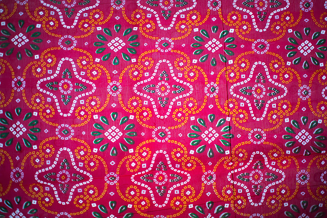 This distinctive tie-and-dye work is characterised by patterns on vibrant backgrounds, created by pinching and pushing small portions of the fabric into small points, and knotting and twisting them with the help of thread. The fabric is then dyed in different shades of colour, thereby leaving the knotted parts uncoloured.