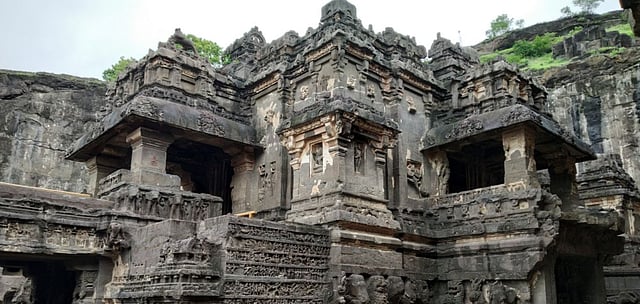 Constructed during the 8th century under the Rashtrakuta dynasty, the Kailasa Temple is a remarkable monolithic structure representing Mount Kailash dedicated to Lord Shiva. Scholars have described the construction process involving excavating three large trenches at right angles into the hillside. These trenches outlined the courtyard and left behind a sizeable isolated rock mass, around 200 ft long, 100 ft wide, and 100 ft high at its highest point.