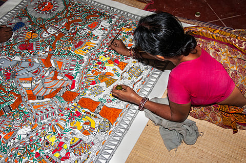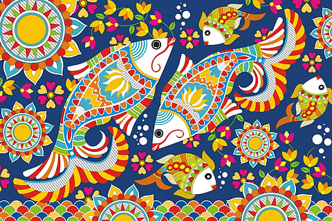 Madhubani art, one of the most prominent folk art forms in India, is practised in the ancient cultural region of Mithila in Bihar and Nepal. Painting is identified to be the most celebrated art form here, especially amongst women, who adorn their walls with detailed patterns on account of marriages and several other festivities. The paintings of the kohbar, the room of the newlywed couples, represents love and fertility, which are usually the primary themes alongside the mythical, folk, and tantric illustrations. It is said that this vibrant folk art dates back to King Janaka, who commissioned the local artisans to paint the marriage of his daughter Princess Sita with Prince Rama.