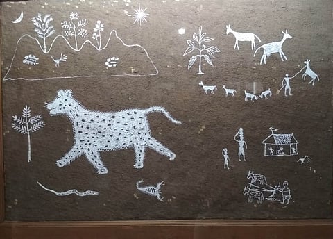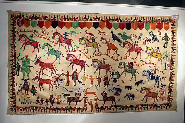 Originating from pre-historic cave paintings, the Pithora painting style, closely connected to divinity and considered a divine process, is more than thousands of years old. Practiced by the Rathwa, Bhils, and Bhilala tribes, who are part of the larger Bhil community, the hallowed Pithora art, can only be created by an artist who is able to channel the spiritual aspect of nature. These paintings are the narrators of the socio-religious history of the tribe, and nowadays also a journal of current times, which are not too fair towards the artists. The Pithora-painting tribes live in both Gujarat and Madhya Pradesh, and they begin painting only if they have a good first harvest, and that too after the festival of Diwali has passed.