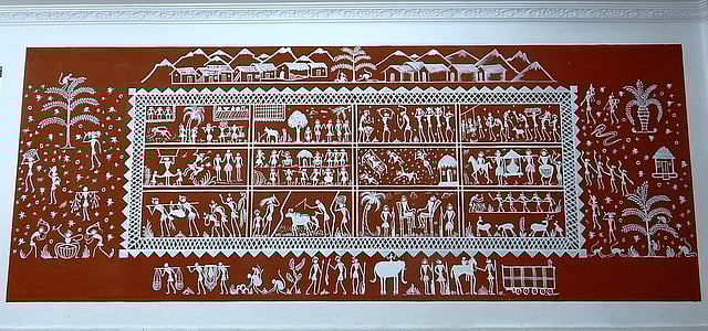 When painted on the walls of the adobe huts, the background of the paintings is of red or yellow ochre mud. This surface is then painted with brushes made of bamboo shoots. Traditionally, natural dyes made of stone, seeds, and flower and leaf juices were used, and the meanings of the ikon were explained to the tribe by the priestly class. These practices, however, have almost disappeared.