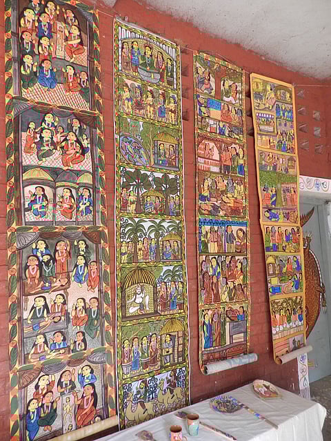 The Patua or Chitrakar are a clan by themselves once found across the districts of Midnapur (now split into two), Birbhum, Bankura and South 24 Parganas in West Bengal. Essentially artists, they prepared the painted &lsquopata&rsquo (pronounced as &lsquopot&rsquo) or square-shaped paintings. Although little is known about the origin of the &lsquopata&rsquo, it is believed that the word originated from the Sanskrit word &lsquopatta&rsquo meaning cloth. The pata would be made of specially treated stiffened pieces of cloth and painted with natural dyes. One section of these artists, who doubled up story tellers, would make a long scroll divided into many frames depicting scenes from the narrative. These scrolls could be folded up and thus called &lsquojorano pata&rsquo. In fair weather, especially during festive season, they would travel from village to village, with their portable scrolls. In front of a suitable gathering, they would unfold the long scrolls, frame by frame, and narrate the stories painted on them. In ancient times, tales from religious texts, epic poems and mythologies, formed the bulk of the narratives. Later, they would draw upon contemporary events too to spice up their repertoire.