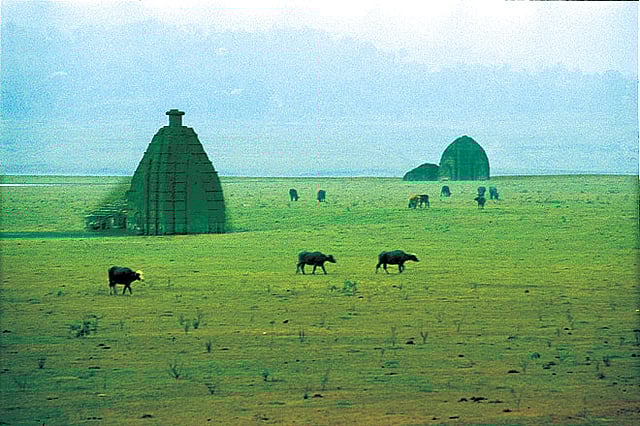 A small haystack-shaped temple stands in the distance. I quickly walk around it looking for a door but find none. Finally, a stone lintel, level with the ground, reveals that the main part of the temple is under silt. Only the shikhara is visible.