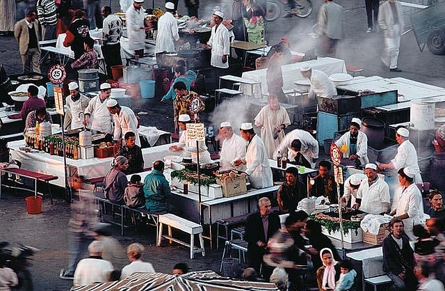 Jemaa El Fna is ringed by cafés and big gloomy restaurants that feel incredibly like Koshy's in Bangalore. Waiters will let you sit around for hours (in the Café de France they will also take hours to serve you) and these are great places to people-watch. The food stalls set up in the square every evening offer a unique eating experience, great value for money and didn't upset these travellers' stomachs. If you are getting sick of Moroccan food, head to Guéliz, where you can eat everything from fast food (there is a big McDonald's at Place du 16 Novembre) to Continental haute cuisine &mdash there's even an Indian restaurant called Salaam Bombay (1 avenue Mohammed VI) run by people from Chennai.