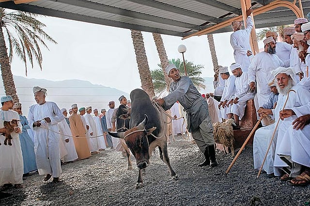 A bull bolts and lunges into the crowd. Men in white, starched dishdashas and women in black, flowing burkhas scream and scatter like animated chess pieces, but soon enough order is restored. I am at the Friday goat market in Nizwa, capital of the Sultanate of Oman back in the 6th century. It is set against the backdrop of the Nizwa fort and the souq, one of the country&rsquos oldest bazaars. There is a diversity of livestock at the &lsquogoat market&rsquo &mdash sheep, cows and very big bulls. The goats are diverse too the white, bearded ones are from Salalah in South Oman, the shaggy, curly hoofed ones are Jebel Akhdaris. Making up the numbers are shaggy any-old goats, grouped together as &lsquoOmani goat&rsquo. The livestock are all being marched counter-clockwise in a circular parade before raucous bidders. Some obstinate animals have to be cajoled to join the show, while others flaunt their haunches.