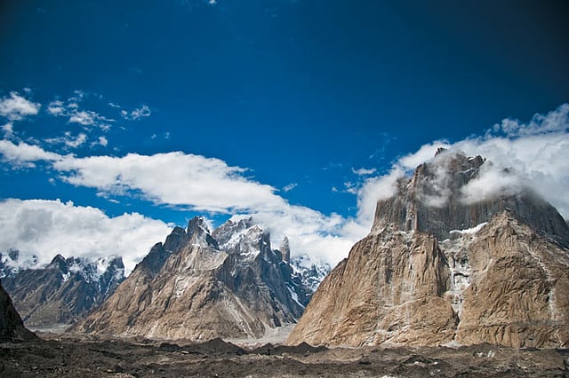 The next day we rounded a spur and saw the Baltoro Glacier, emerging between the mountains like the swollen, grey tongue of an enormous, prehistoric lizard. A river shot out of its yawning mouth. To the left were a set of majestic granite spires and pyramids rising thousands of feet from the glacier, too steep to retain snow. These were the lowest of the Baltoro aristocracy, which boasted of the greatest concentration of 7,000 and 8,000m peaks anywhere.