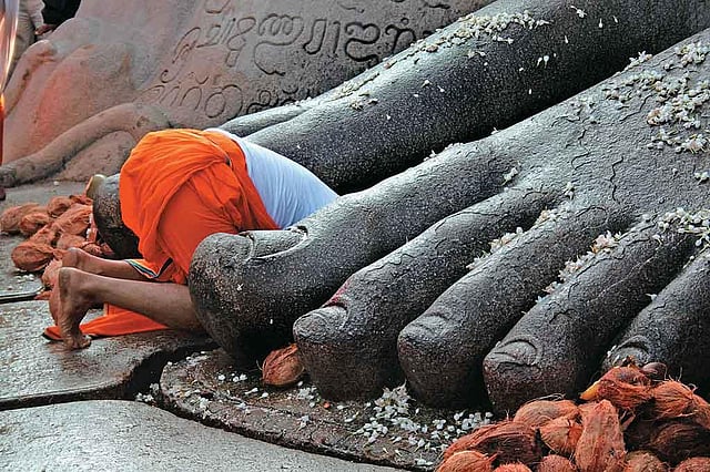 In season, between September and July, Sravanabelagola gets about 4,000 visitors a day. It is the highlight of the Jain pilgrimage circuit in Karnataka. Even during the off-season, says the official at Tourist Information, about 500 people come every day, but just now we seem to have plenty of elbow room. The village, a string of vegetarian hotels and shops selling ten-inch and five-inch Gomateswaras in every colour, lies between the two granite hills of Vindhyagiri and Chandragiri, which are dotted with shrines to the 24 tirthankars or &lsquoford-crossers&rsquo.