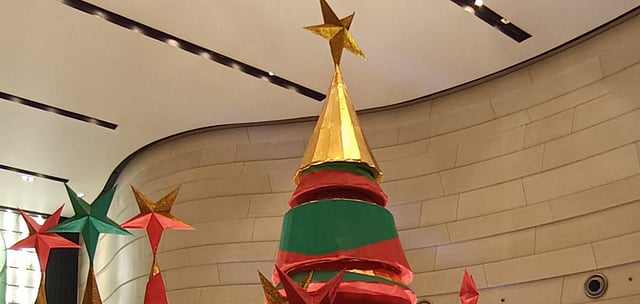 The installation stood among the very well-mannered kids and their even more polite Santa. The trees formed a cluster, which was draped in swatches of jade, crimson and dull gold, taking up the centre of the lobby.