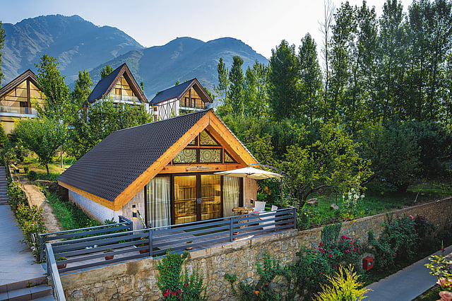 Tucked away on the outskirts of Srinagar, Rah Bagh is a tranquil sanctuary nestled amid four acres of apple orchards and manicured gardens, with the majestic Zabarwan mountains rising dramatically in the backdrop. This luxury boutique resort offers sweeping views of the Dal and Nageen lakes and captures the spirit of alpine elegance through its chalet-style architecture.