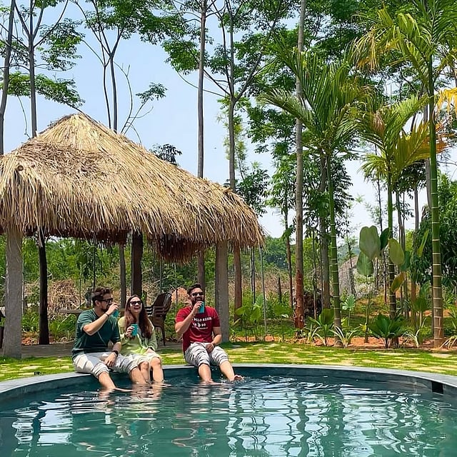 Just a short drive from Bangalore, Virama Farm Stay offers a peaceful escape without straying far from the city. Perfect for large gatherings, the property comfortably hosts over 35 guests, featuring a spacious 6-bedroom villa, five king-sized suites, and a cosy 10-bed bunker room—ideal for family get-togethers, corporate retreats, or intimate celebrations. Unwind by the swimming pool or enjoy a magical movie night under the stars with their outdoor projector. Best of all, pets are welcome, so your furry companions can be part of the fun too.