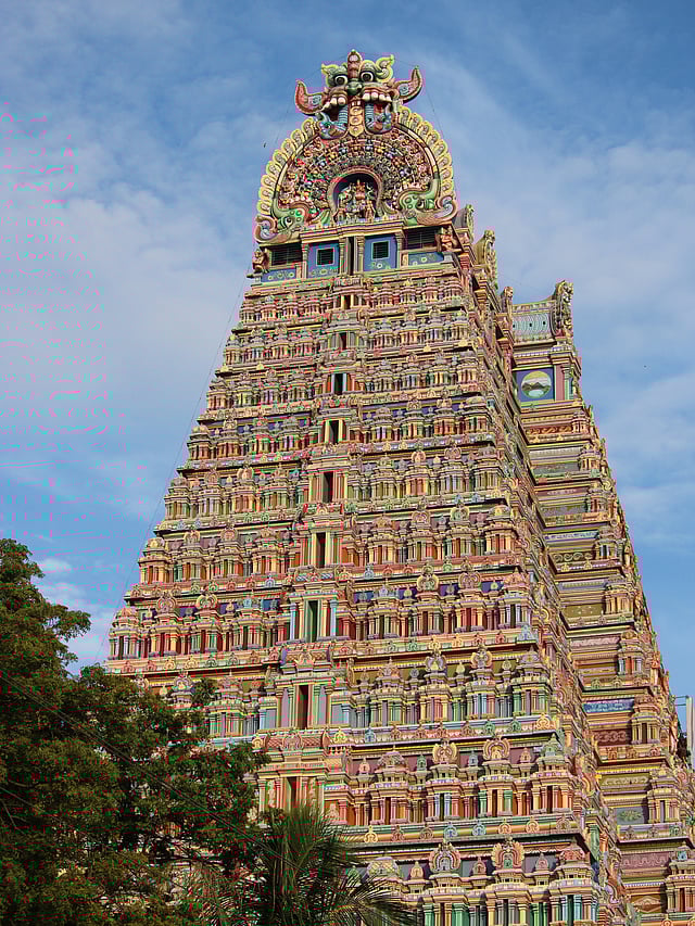 This temple, located on an island a few km off Trichy, is a prime attraction devoted to Lord Vishnu. Built in Dravidian architectural style, the temple complex features seven concentric circles and 17 major gopuramas, 50 shrines, a hall with a thousand pillars, and nine sacred water pools. The main gopuram extends to 13 storeys.