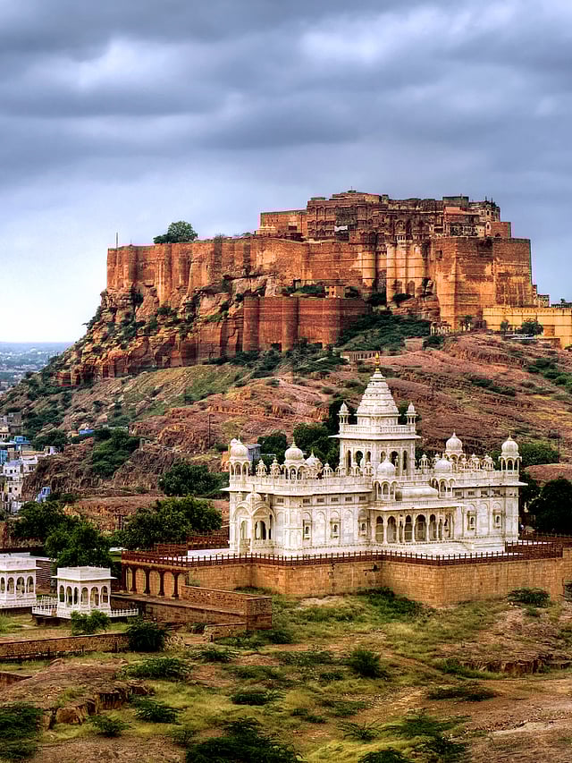 Towering above the Blue City, Mehrangarh is an imposing fort known for its massive walls, expansive courtyards, and a museum showcasing royal artefacts.