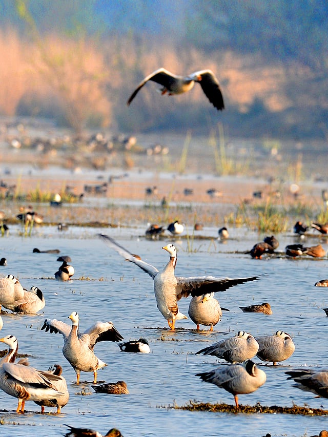 These geese migrate over the Himalayas, flying at altitudes above 7,000 metres. They travel from Central Asia to India, demonstrating extraordinary endurance in low-oxygen, high-altitude conditions.