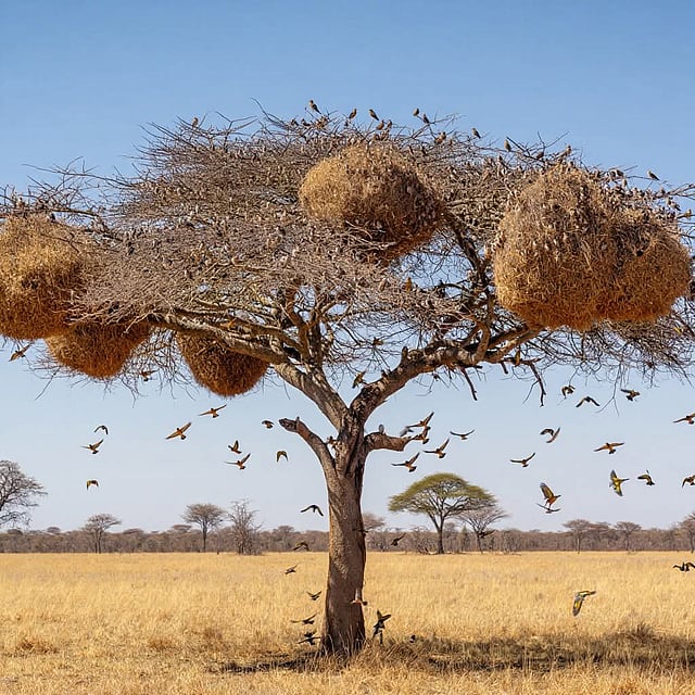 Weaver birds craft woven nests from grass and leaves, suspended from branches. Their hanging nests deter predators, withstand weather, and demonstrate meticulous avian construction skills across regions.