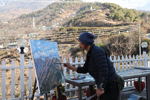 A few canvases down the line, a Thai artist, Sangiam Yarangsee, continued painting in a rhythmical manner, never stopping to converse, but only to glance up at the spectacular view of the mighty and mist-laden Dhauladhar range—a muse to the 47 artists attending Chitrashaala 2024.