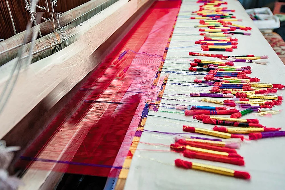 Making these beautiful saris is a time-consuming process: first, artisans collect the silk threads, known as zari, and dye them in vibrant colours like neelgunji (blue), kalichandrakala (pure black sari with red border), aboli (peach pink), firozi (white, red, and pale green), and mustard. Then, the dyed threads are meticulously threaded onto a loom to set the base for weaving. The threads are spun using a charkha so that the process of designing can begin. These are often inspired by traditional motifs like peacocks, lotuses, and geometrical patterns. Using a shuttle, the designs are woven into the fabric to bring the intricate patterns and motifs to life. Next, the pallu is carefully woven with detailed patterns, while the border is added to give the sari its final touch. The completed product is then removed from the loom.