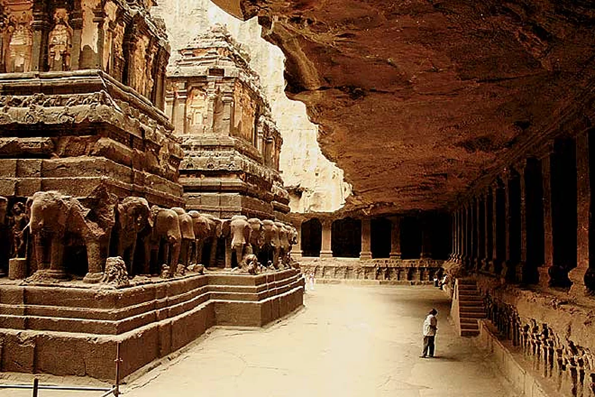 Although constantly outshined by its counterpart Ajanta, Ellora still holds a certain appeal to the discerning traveller, as it is one of the largest rock-hewn monastic-temple complexes in the world. Located 30 odd kms away from Aurangabad, the caves of Ellora were carved out of the step-like formation of volcanic deposits in the Western Ghats. There are 12 Buddhist viharas, 16 Hindu and five Jain temples in Ellora. However, the most astonishing of the lot is Cave 16, renowned as the Kailash Temple &ndash a giant monolithic excavation.